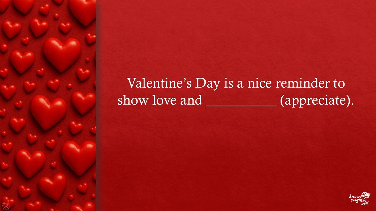 „Agree or Disagree? Valentine’s Day Edition” to zestaw stwierdzeń o Walentynkach, związkach i sposobach okazywania miłości w codziennym życiu. Dodatkowo, każde zdanie zawiera również jedno słowo, które trzeba wstawić w odpowiedniej formie.